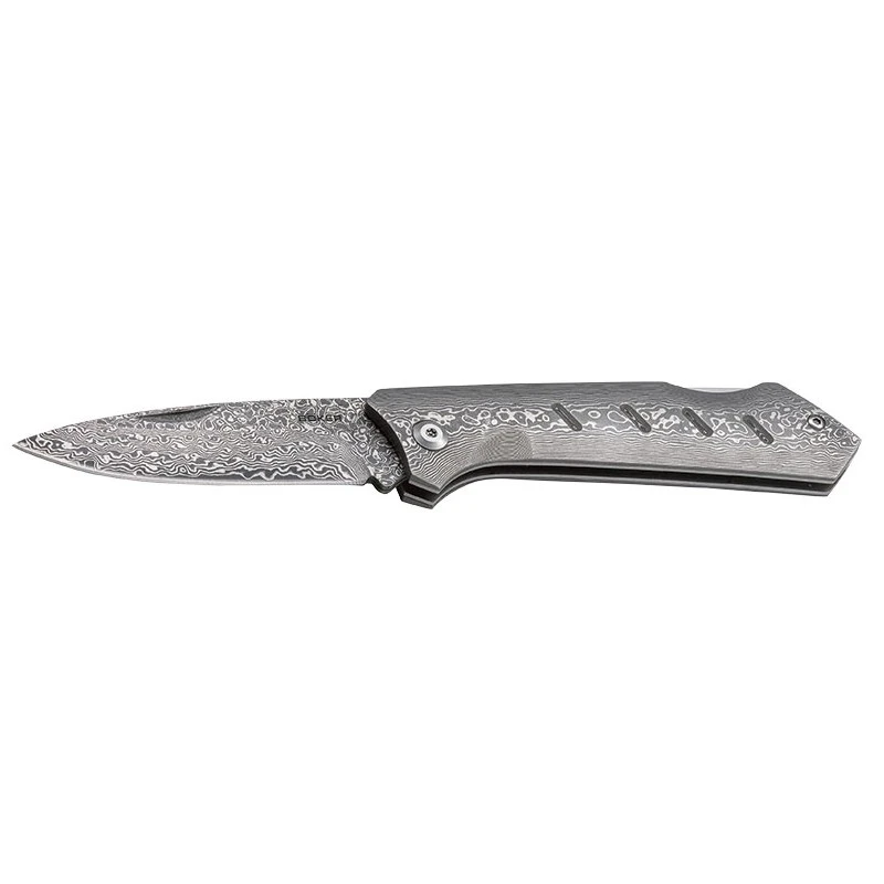 Le Damascus Dominator 01BO511DAM, signé Böker Plus, est un couteau qui marque les esprits. Il faut dire qu’il se compose non seulement d’une lame en damas 71 couches mais aussi d’un manche en damas ce qui est particulièrement original. Il en résulte un couteau pliant à l’aspect très décoratif puisque l’acier damas est caractérisé par la présence de petits motifs.