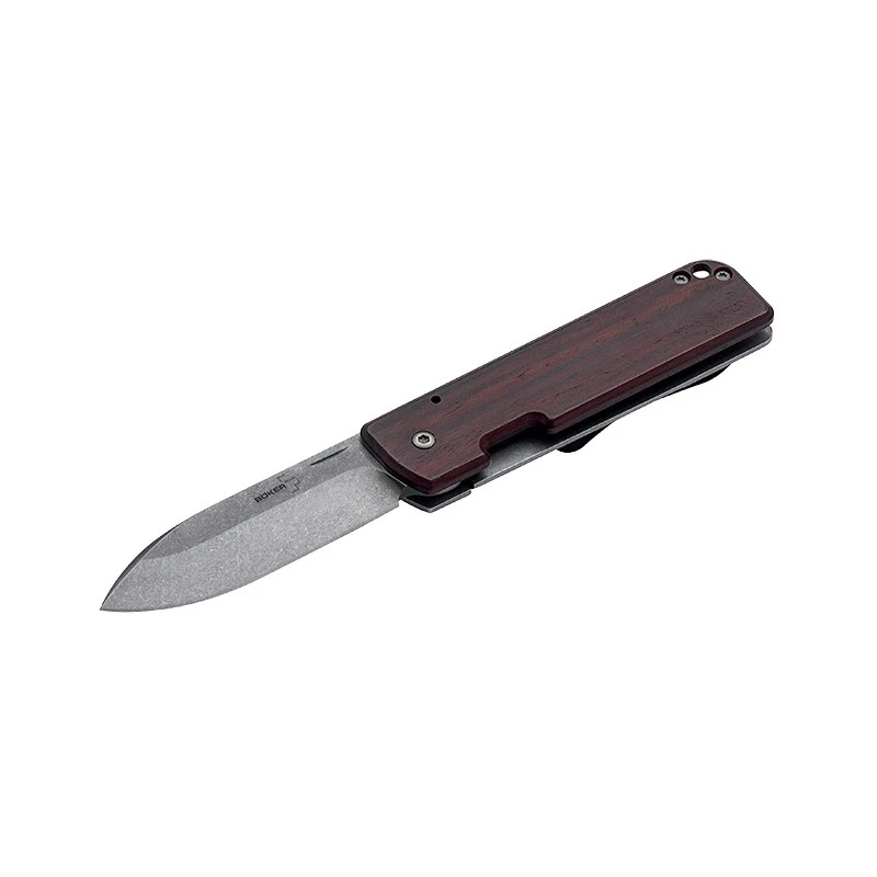 Le bois cocobolo se reconnaît assez facilement pour son coloris rougeâtre, assez sombre. Justement, c’est ce même matériau noble qui a été choisi par le designer Ukrainien Serge Panchenko lors de la conception de ce couteau pliant Lancer 42 Böker Plus. Comme pour les autres Lancer 42, ce modèle 01BO468 dispose d’un système d’ouverture nail nick, les bilingues comprendront aisément qu’il faut utiliser l’ongle pour déployer la lame. Une lame de 72mm de longueur, à la finition satinée, et fabriquée en acier D2, profil drop point. Elle est marquée par le logo Böker Plus ce qui ne manquera pas de faire plaisir aux fans de la coutellerie Allemande. Ce Lancer 42 bénéficie également d’un manche de 93mm de long, en bois cocobolo, avec clip de poche tip-up au dos (détachable) et trou sur le côté pour l’ouverture de la lame. Un autre trou, plus petit, situé en bout, permet d’y passer de la corde/ficelle en vue d’accrocher le couteau. À noter que le manche en cocobolo renferme le système de verrouillage frame lock. Bois au niveau de la face avant, et acier gris au dos, un mélange de matériaux bien choisi pour un maximum de style !
