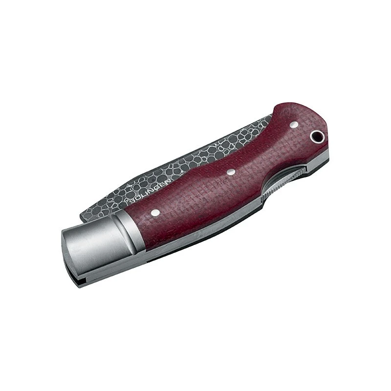 Le couteau Boxer Damascus 111025DAM se dote d’un manche en micarta coloris bordeaux, avec écailles conférant un effet stylé fort sympathique. Sa taille de 103mm ainsi que sa forme garantissent un grand confort au moment de la prise en main. La facilité de port est au rendez-vous grâce au trou de lanière renforcé. On mentionnera également la présence d’une mitre avec rainure qui n’est autre que la « marque de fabrique » de Raphael Durand. Avec ce modèle d’exception, vous n’aurez pas n’importe quel couteau entre les deux mains, mais le Boxer Damascus 111025DAM !