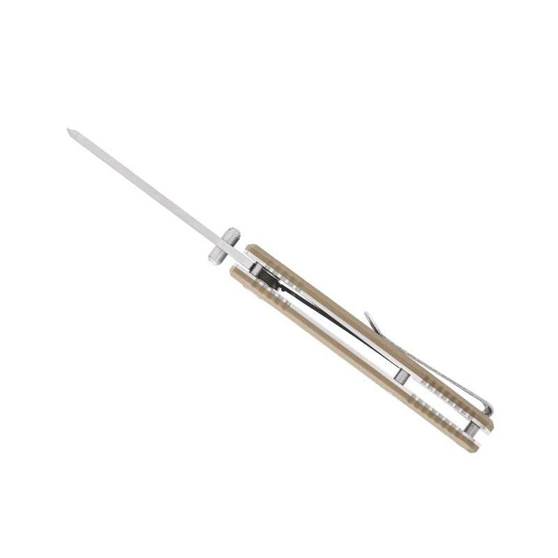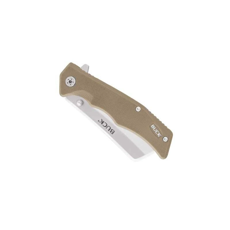 Ce couteau pliant Trunk, par Buck Knives, modèle 0252TNS, se distingue par son manche de couleur beige. Un coloris que l’on rencontre assez rarement en coutellerie de poche, et c’est ce qui fait justement toute l’originalitĂ© du Trunk ! La poignĂ©e de 10cm de long est fabriquĂ©e en G10, un matĂ©riau qui offre du confort lors de la prise en main, mais aussi une forte rĂ©sistance (froid, chaleur, agents chimiques). L’inscription Buck est prĂ©sente, en blanc, il y a aussi un clip au dos pour simplifier les dĂ©placements avec le couteau. Le Buck Trunk 7252.TNS possède une lame Cleaver, couperet, de 73mm de longueur, en acier 7Cr. Capable de rĂ©pondre favorablement aux situations les plus exigeantes, la lame s’ouvre Ă vive allure grâce au flipper ainsi que le bouton double, elle se verrouille efficacement via le mĂ©canisme liner lock. La lame est marquĂ©e par le logo Buck et personnalisable par gravure en supplĂ©ment. Le Trunk existe aussi en coloris noir.