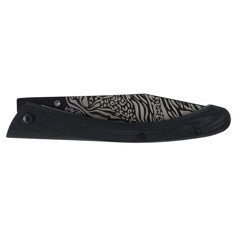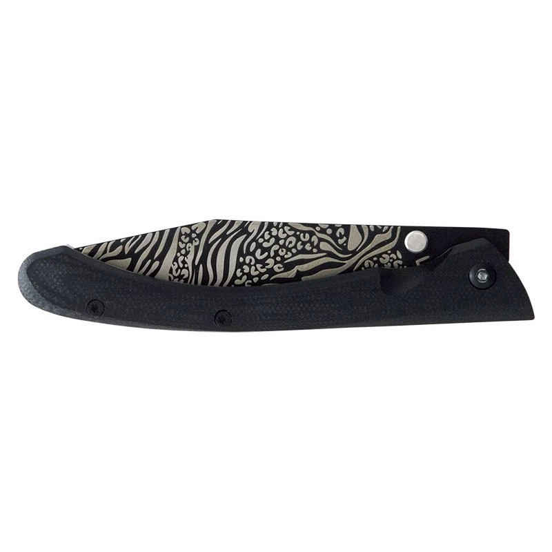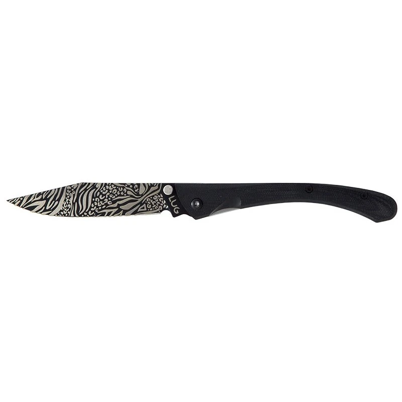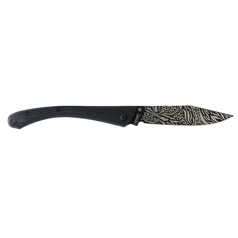 Issu de la collection LUGART LIMITED, ce couteau pliant C63 Animal est designé en France par Cyril Ganivet. Léger et design, il est caractérisé par une lame en acier inoxydable 7Cr17MoV au revêtement titane noir PVD. Mais ce qui fait toute son élégance, c’est incontestablement sa gravure laser d’un motif tatouage « animal » sur chacune des faces. Vous ne vous lasserez pas de l’admirer, ni de l’utiliser ! Son déploiement est par ailleurs facilité par la présence d’un bouton de pouce volumineux positionné juste à côté de l’inscription LUG.
