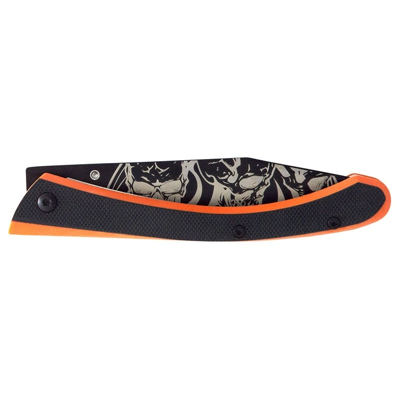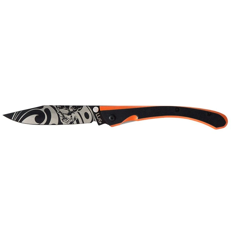 On peut affirmer sans prendre de risque que ce couteau C63 Bad Boy de chez Lug a une allure extrêmement moderne, dans l’ère du temps. Designé et assemblé en France, il comprend une lame tatouée au laser sur les deux faces par des motifs crânes. De belles décorations graphiques qui font passer un message ! Pour rappel la lame d’environ 8cm est fabriquée en acier inoxydable 7Cr17MoV et comprend un revêtement titane noir PVD.