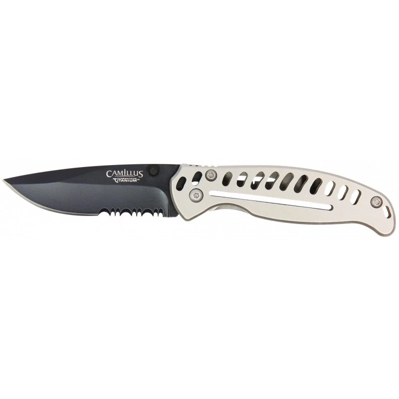 Le Camillus EDC3 est incontestablement un excellent couteau pliant pour un usage quotidien. Cela explique son nom, car il faut savoir que EDC signifie Everyday carry. Ce modèle 19166 possède une lame d’environ 72mm de long en acier AUS-8 avec traitement Carbonitride titanium. Cela améliore considérablement les performances, notamment la résistance à la corrosion. La lame noire est partiellement dentée pour une polyvalence toujours plus grande, il intègre un double boutons ainsi que le système de fermeture liner lock. La lame est comme c’est souvent le cas marquée par le logo Camillus avec inscription Carbonitride Titanium, de couleur claire pour le contraste. Le manche du couteau pliant Camillus EDC3 est argenté, ajouré, et fabriqué en acier inoxydable. La poignée apporte, grâce à ses multiples ajours, de la légèreté, elle mesure 10cm de long afin de faciliter les déplacements quotidiens. Quoi de plus normal pour un couteau de type EDC !