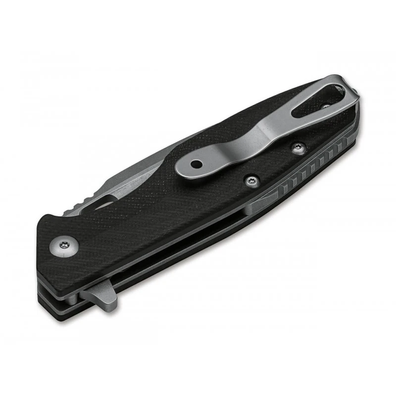 Le Böker Plus Caracal Folder est un célèbre couteau tactique & utilitaire. Son petit frère, à savoir le Caracal Folder Mini, va dans la même direction, c’est une réalisation du designer Boris Manasherov. Ses dimensions plus compactes (longueur de 102mm) permettent de le transporter, le ranger plus facilement au quotidien. Les plaques en acier sont revêtues de G10 noir, un matériau prisé pour sa durabilité ainsi que sa légèreté. Un trou pour lanière est présent, il se situe au niveau de l’extrémité, tandis qu’un clip de transport repositionnable est de la partie au verso du manche.