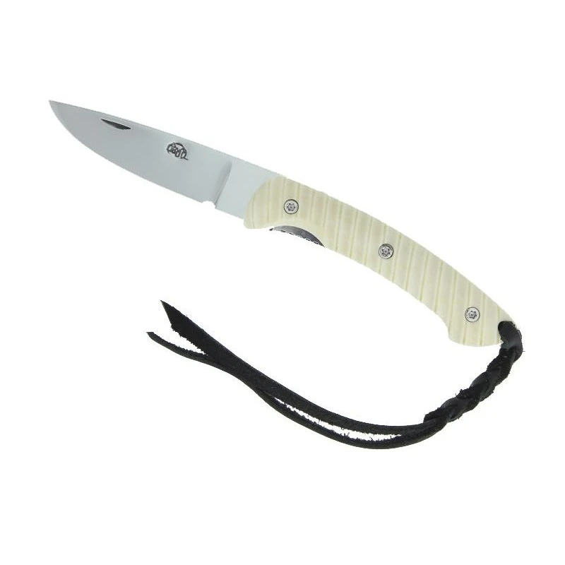 Le Citadel Kampot 63120 est un couteau de poche fabriqué artisanalement : c’est un modèle de très bonne facture. Et son appellation « couteau de poche » ne doit rien au hasard, c’est parce que son manche mesure 11cm de longueur, autant dire qu’il tiendra sans problème dans toutes les poches, même les plus petites. Robuste, le manche est aussi très élégant : il est fabriqué en os de buffle blanc avec intercalaire rouge. À noter que le manche est aussi qualifié de « zebra » en raison de ses nombreuses rayures décoratives. Un lacet noir est également présent pour pouvoir accrocher n’importe où le couteau Citadel Kampot 63120, un lacet très pratique lors des sorties Outdoor. Côté lame, pas de surprise, elle est encore une fois conçue en acier inoxydable N690Co, c’est l’acier le plus utilisé chez la coutellerie Citadel. Ce couteau est livré avec sa pochette en nylon très pratique lors des transports.