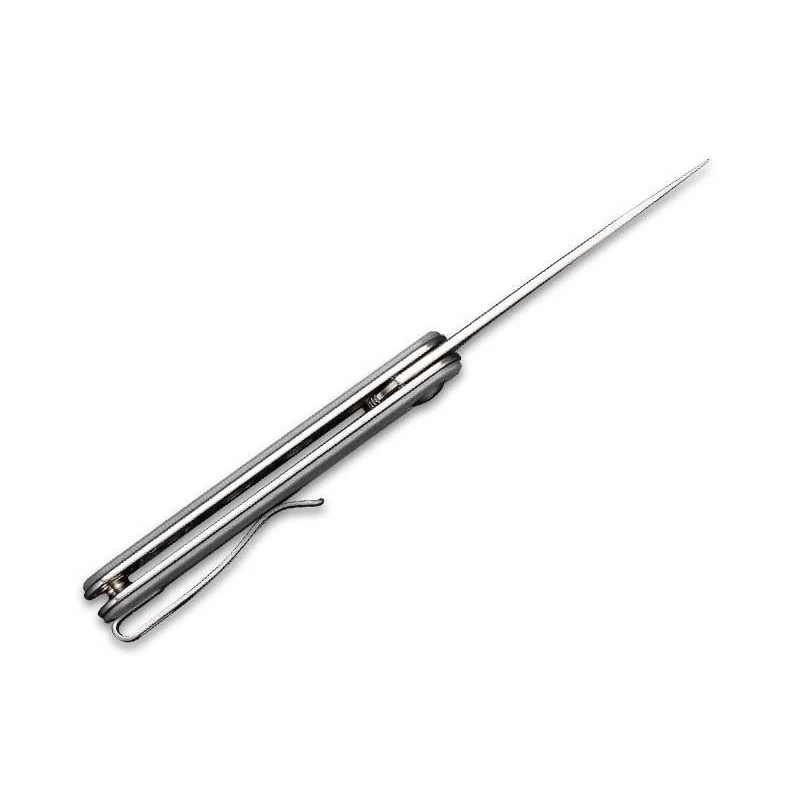 Un design extrĂŞmement propre, sans fioriture, pour ce couteau Civivi Lumi C200242. Son manche en acier inoxydable est surmontĂ© de plaquettes grises en G10 sur lesquelles on peut observer le logo Civivi d’un coloris contrastĂ© qui saute aux yeux. Le petit dĂ©tail qui plaira aux fans de la marque ! De l’autre cĂ´tĂ© de la poignĂ©e, on peut apercevoir un clip ajourĂ© en inox permettant de facilement transporter le couteau au quotidien.