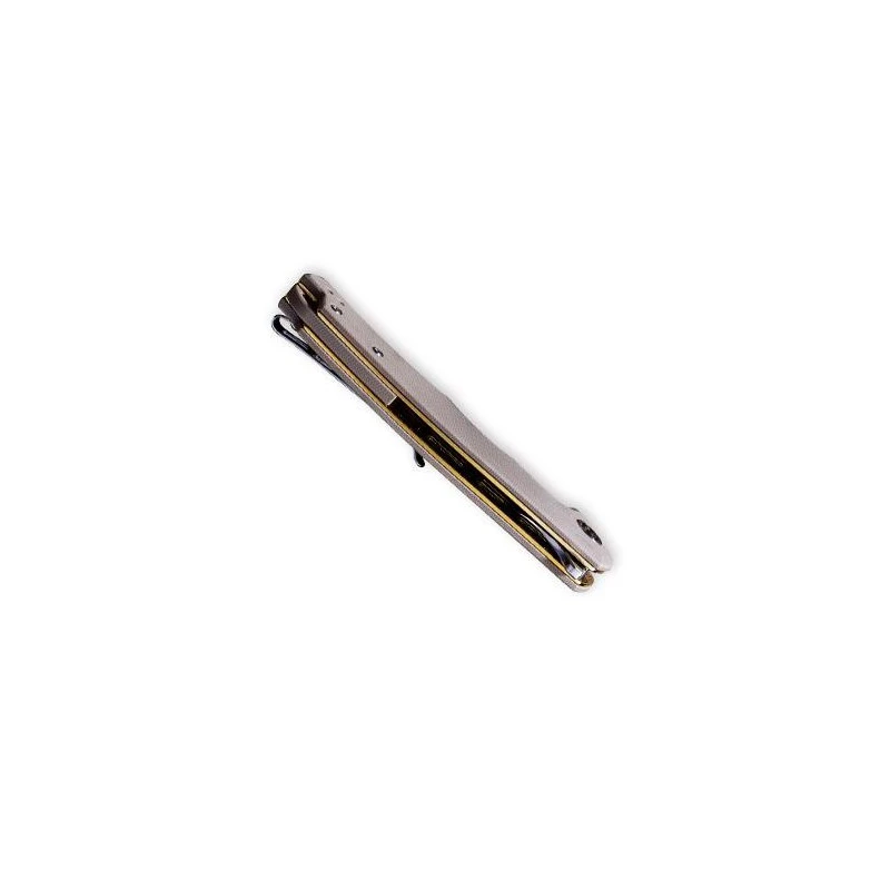 Le couteau Civivi Praxis C803B allie Ă©lĂ©gance et facilitĂ© de transport. Il possède un manche en acier inoxydable dorĂ© avec plaquettes et entretoise en G10 marron clair pour une Ă©lĂ©gance de tous les instants. On peut d’ailleurs distinguer assez facilement le logo de la marque Civivi, un petit dĂ©tail qui va Ă©normĂ©ment plaire Ă tous les inconditionnels de la marque. La facilitĂ© de transport est rendue possible Ă l’aide d’un clip rĂ©versible ainsi que par la longueur de la poignĂ©e : seulement 12cm. Autre prĂ©cision importante, le couteau Civivi Praxis marron C803B est lĂ©ger avec un poids total d’environ 125 grammes. CĂ´tĂ© lame, elle est fabriquĂ©e en acier 9Cr18MoV satinĂ© avec flipper, mĂ©canisme ball bearing et cran intĂ©rieur. Une lame tranchante de longueur 95mm qui se dĂ©ploie avec beaucoup de facilitĂ© pour vous apporter le tranchant dont vous avez besoin ! Ă€ noter que la lame est personnalisable par gravure (voir bouton ci-dessous).