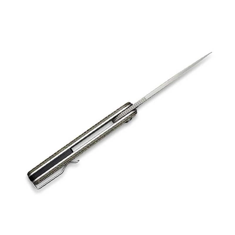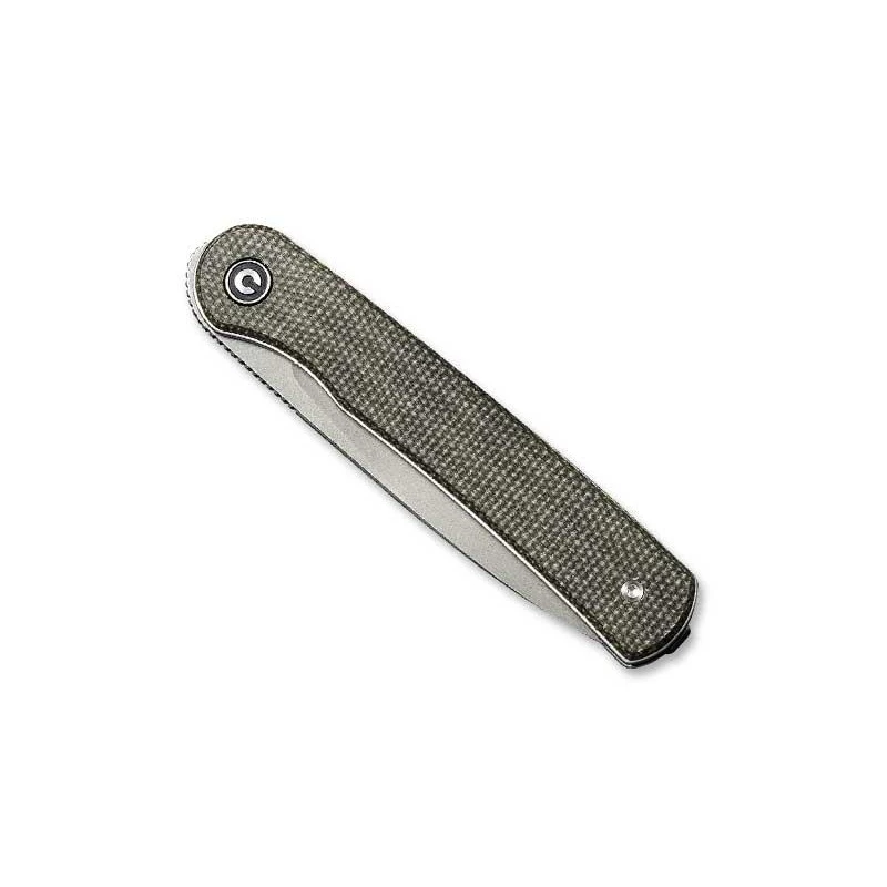Un couteau qui ne manque pas de style, et c’est peu dire ! Le Civivi Stylum C20010BC est ici muni d’un manche en acier inoxydable gris avec plaquettes en micarta vert foncé, sans oublier la présence d’un discret mais élégant logo Civivi noir avec écriture blanche. De longueur 10cm, il tient bien en main et intègre une entretoise en G10 noir ainsi qu’un clip en acier inoxydable au dos pour offrir une grande facilité de transport. Il est livré dans une belle pochette en nylon noir.