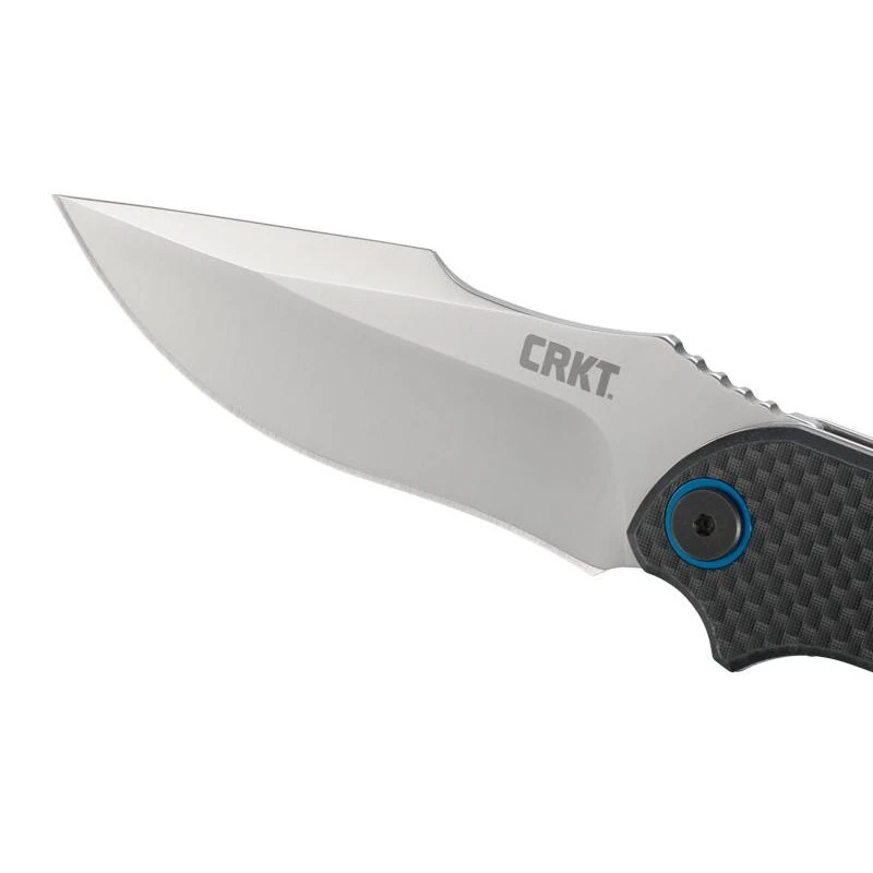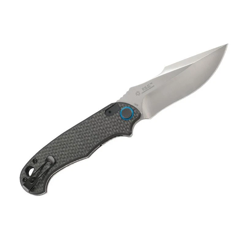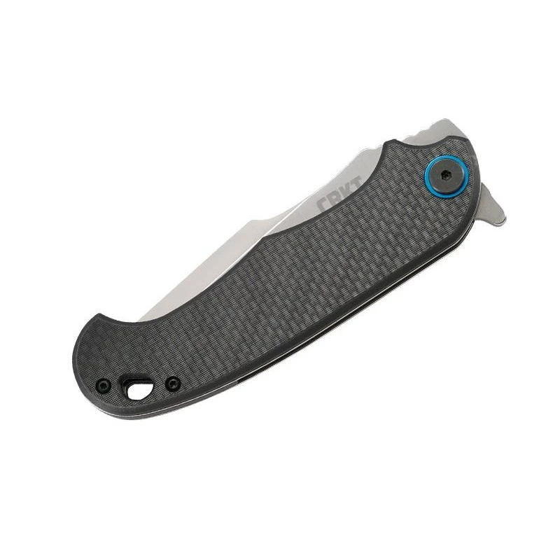 Le couteau CRKT PSD possède un manche fabriqué en fibre de carbone ainsi que G10 coloris noir, un choix astucieux qui assure de la solidité sans alourdir le couteau. Un backspacer avec nuances bleues est de la partie, cela apporte son lot d’élégance, de style. Un ajour au bout de la poignée est présent, il fait office de passe-lacet ou encore passe-cordon, afin de pouvoir attacher le PSD où bon vous semble. Clip de poche noir au dos.