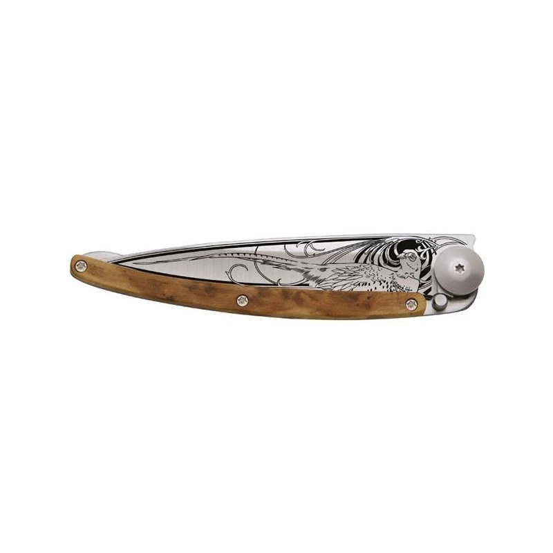 Ce couteau pliant Deejo Tattoo rĂ©fĂ©rence 1CB038 est muni d’une lame en acier inoxydable 420 Ă cran intĂ©rieur dĂ©corĂ©e d’un très beau motif faisan, le oiseau de chasse par excellence. De ce fait, nul doute que ce couteau de poche plaira aux chasseurs expĂ©rimentĂ©s ou non. La lame de longueur 9,5cm peut ĂŞtre gravĂ©e au niveau de la face verso (+8,90€). Au niveau du manche, il est essentiellement fabriquĂ© en acier inox et intègre aussi une plaquette en loupe de genĂ©vrier apportant une touche esthĂ©tique très apprĂ©ciable. Le manche squelette mesure prĂ©cisĂ©ment 11cm de long, de quoi permettre aux chasseurs de toujours avoir leur couteau Ă disposition lors des sessions de chasse intensives. Ce couteau Deejo TATTOO motif faisan est en plus très lĂ©ger en ne pesant que 37 grammes, il sera presque oubliĂ© dans la poche !