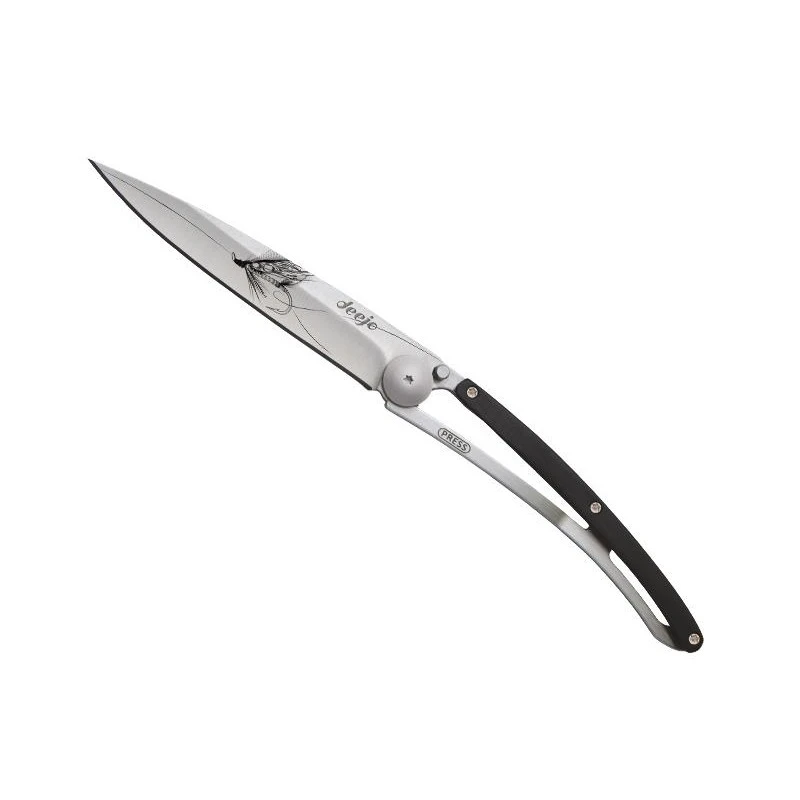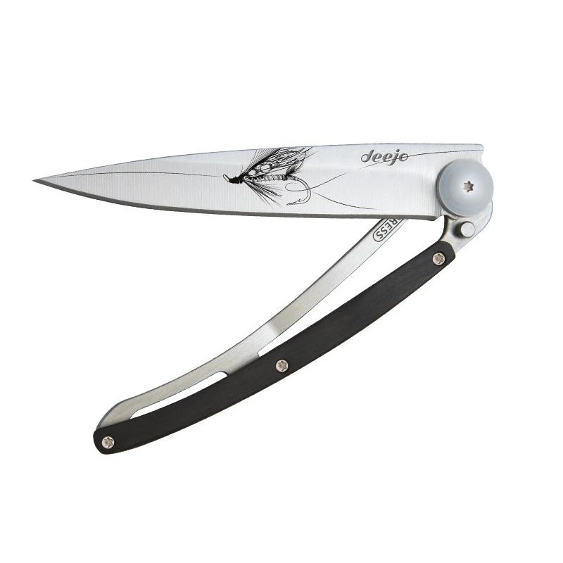 Le manche squelette est lui fabriqué en acier inox et décoré d’une plaquette noire en bois ébène pour la touche design. De plus, le bois ébène est un matériau quasiment insensible à l’humidité ambiante : il est également très robuste. Très beau, le manche est aussi très facile à manier en raison de son petit gabarit : seulement 11cm de longueur, de quoi permettre aux fans de pêche de toujours avoir leur couteau Deejo Tattoo 1CB036 à disposition. L’autre point fort de ce couteau de poche, c’est sa légèreté avec un poids total de seulement 37 grammes.