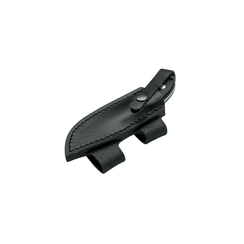 Le Böker Plus J-Bite, c’est aussi un manche noir en G10, riveté à deux reprises, tenant parfaitement dans la main grâce à sa petite taille (longueur approximative 85mm). Le couteau fixe est doté d’une sangle d’arrêt à l’extrémité de la poignée, elle s’attache à l’étui cuir noir fourni ce qui empêche le poignard de glisser volontairement. Mesdames, messieurs, vous avez face à vous un allié de choix pour toutes vos aventures Outdoor !