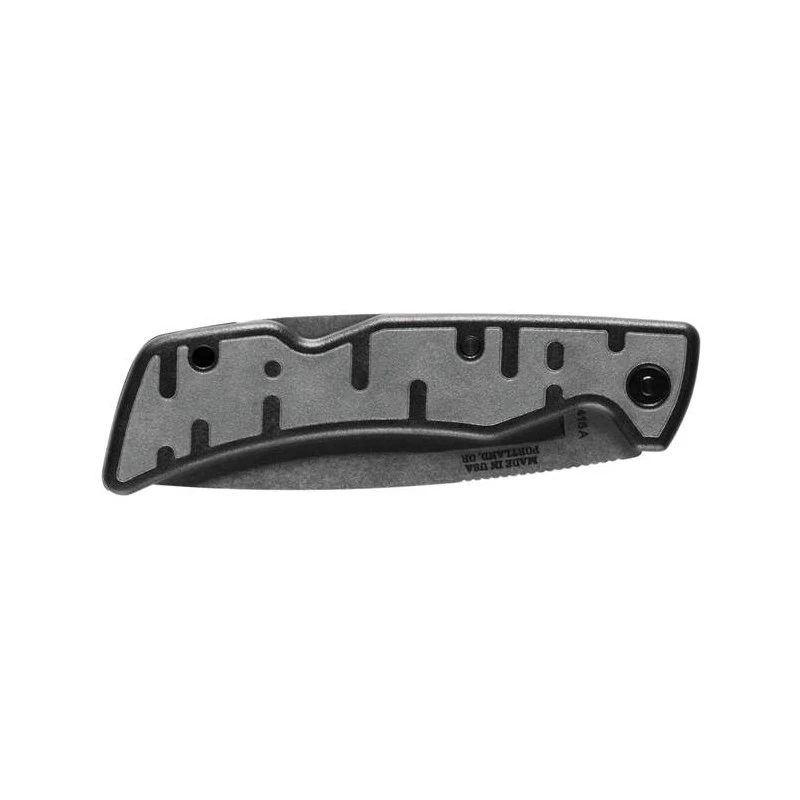 Le Commuter de chez Gerber, modèle GE003136, est un couteau plein d’élégance, notamment en raison de son manche gris/noir en nylon avec inserts en caoutchouc pour plus d’adhérence et donc une ergonomie améliorée. Ce mélange de couleurs et de formes au niveau de la poignée confère énormément de charme, à noter que le manche mesure 107mm de long, il se range de ce fait aisément n’importe où. Il faut aussi mentionner la présence d’un petit trou pour y passer de la corde ou ficelle en vue d’attacher le couteau.