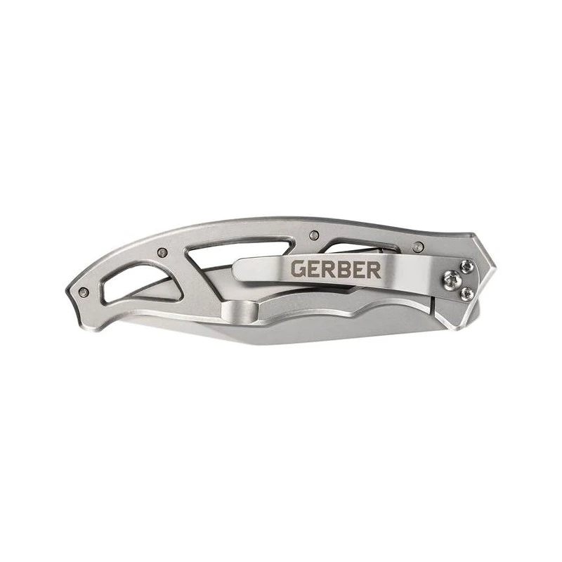Conçu et fabriqué par Gerber, coutellerie Américaine de très haute renommée, ce couteau Paraframe I (GE003626) ne vous laissera sûrement pas indifférent. Dans un premier temps, votre œil se jettera très certainement sur le manche en acier gris avec cadre ouvert. Les ajours dans le manche apportent énormément d’élégance, le couteau Gerber Paraframe I est de ce fait très moderne. En plus, ces « trous » rendent très logiquement le couteau toujours plus léger, et donc toujours plus transportable (longueur du manche légèrement supérieure à 10cm en position fermée). Il est important de mentionner la présence, au dos, d’un clip en acier marqué par le nom de la marque (Gerber) : idéal pour fixer le couteau à la poche ou à la ceinture. Grâce à cela, une chose est sûre, votre couteau Gerber Paraframe I ne sera jamais bien loin …