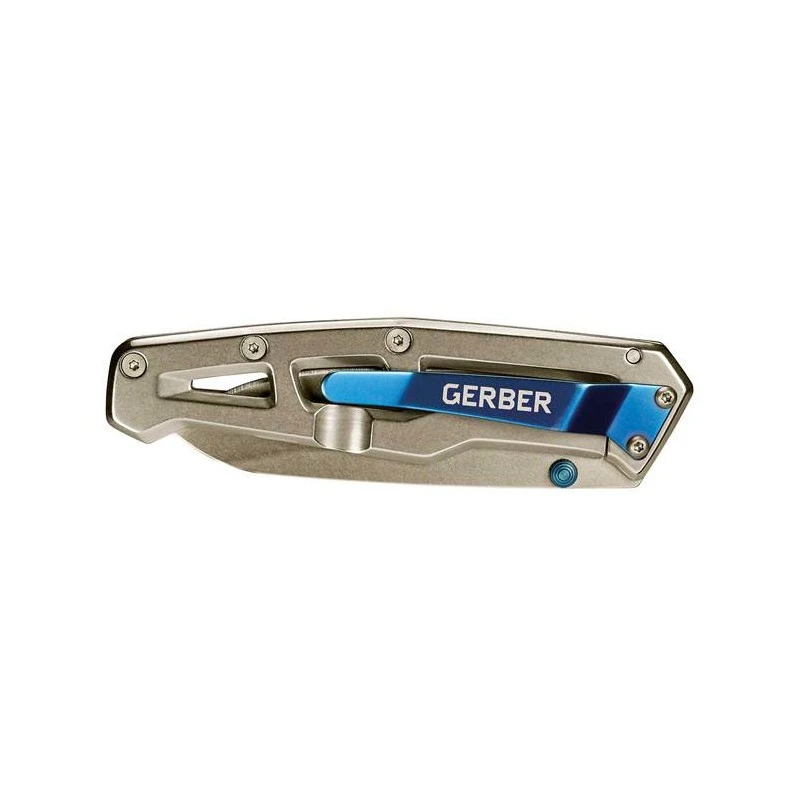 Le Gerber Paralite est un couteau de poche AmĂ©ricain plein d’originalitĂ©. Il s’agit ici du modèle Champagne, rĂ©fĂ©rence GE001345, oĂą le manche en acier, coloris champagne, est ajourĂ© de façon Ă laisser entrevoir la couleur bleue du clip de poche situĂ© au dos. Un clip qui bien sĂ»r, ne sert pas qu’Ă dĂ©corer, puisqu’il facilite grandement les dĂ©placements et mouvements avec le couteau. De toute manière, le manche ne mesure que 104mm de longueur permettant ainsi de glisser le couteau Gerber Paralite Champagne dans n’importe quelle poche. La prise en main est très confortable, notamment de par la prĂ©sence du repose-pouce bleu au niveau de la lame en acier inoxydable 5Cr15MoV (longueur 76mm, profil drop point). Une lame tranchante, Ă personnaliser, qui se verrouille par le biais du système Frame Lock.
