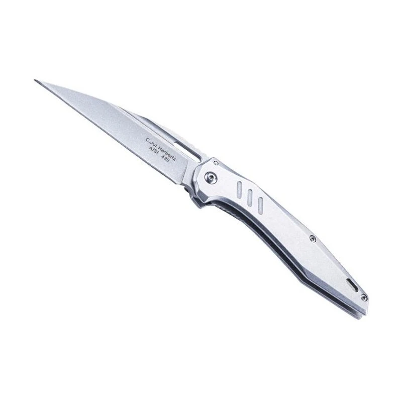 Ce couteau Herbertz 597412 est fabriqué entièrement en acier inoxydable 420 ce qui lui vaut une parfaite résistance à la corrosion, la rouille. La lame présente une finition stonewashed, elle est à trou ce qui permet de l’ouvrir de façon très simple au quotidien. Un mécanisme liner lock garantit que la lame soit bien verrouillée au moment de l’utilisation, par mesure de sécurité bien entendu. De longueur 9cm, la lame est très pointue en bout, et marquée par le texte « C.Jul.Herbertz » ainsi que le type d’acier, soit le 420. La poignée présente elle aussi une finition stonewashed, elle est marquée par trois petits traits en diagonale et mesure 11,5cm de long. Sa forme affinée garantit style et confort d’utilisation en permanence, son clip au dos fait en sorte que les déplacements avec le couteau ne soient jamais un problème.
