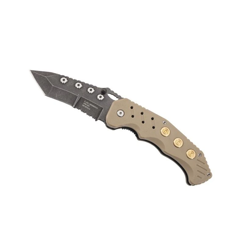 Voilà un couteau de poche qui va énormément plaire aux fans de couteaux Herbertz et d’armement. Ce modèle référence 581612 possède un manche en ABS sable avec des culots de douilles en guise de décoration. Facile à transporter grâce à son petit gabarit (longueur 12cm), le manche est aussi très confortable à manier grâce aux différents creux pour les doigts. Il y a aussi un clip au verso comme sur la grande majorité des couteaux pliants Herbertz. De forme tanto, la lame à dents est fabriquée en acier inoxydable 420 avec finition blackwash, à cran intérieur et à bouton double avec 4 impacts de balle pour la touche décorative. Un couteau de poche Herbertz 581612 à l’apparence très militaire !