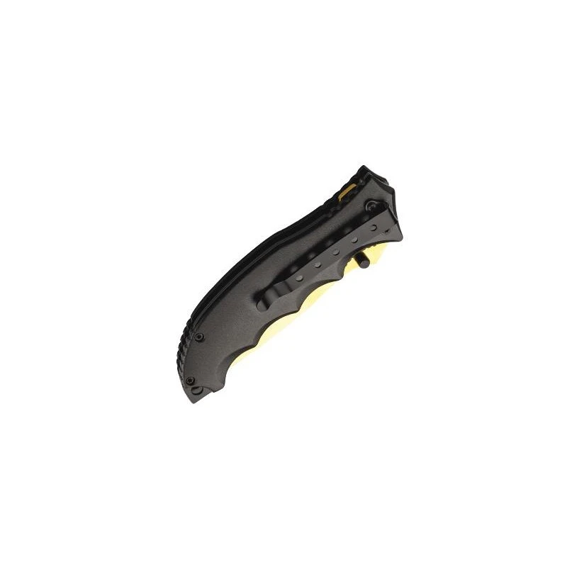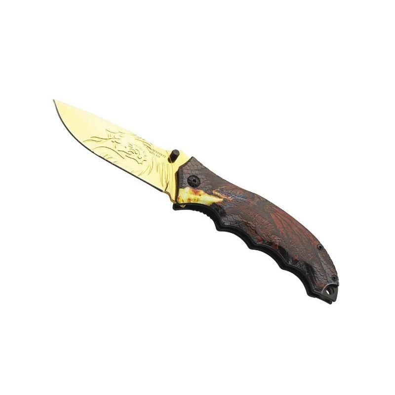 Ce couteau de poche Herbertz 585112 est très original : il va énormément plaire à tous les fans de couteaux, mais aussi de dragons et vous allez comprendre pourquoi. Tout simplement parce que le manche de 12cm en plaquettes ABS noir comprend une décoration photo imprimé dragon sur la face recto, il est même en train de cracher du feu ce qui apporte une touche esthétique. Mais ce n’est pas tout, la lame de ce couteau pliant Herbertz est dorée et fabriquée en acier 420 à cran intérieur et à bouton double. Une lame qui est une nouvelle fois marquée par un motif dragon au recto et personnalisable par le texte de votre choix au verso. À noter que ce modèle se transporte très facilement grâce à son clip de poche au dos du manche imprimé dragon.