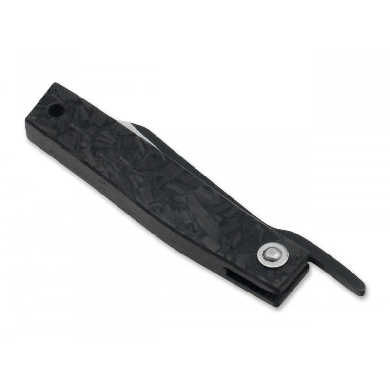 Le Higonokami Bonsai Hikari, signé Böker, référence 01PE319 est incontestablement l’un des plus petits couteaux de la gamme. La particularité de ce modèle, c’est son manche en fibre de carbone, un matériau rarement utilisé quand on parle de couteau traditionnel Japonais. Le manche mesure ici 55mm de longueur, ce qui assure bien sûr une facilité de port permanente, quotidienne, d’autant plus qu’il y a en bout un passe-lacet ou encore trou pour lanière. La longueur totale du couteau est de 95mm, à peine 10cm de long !