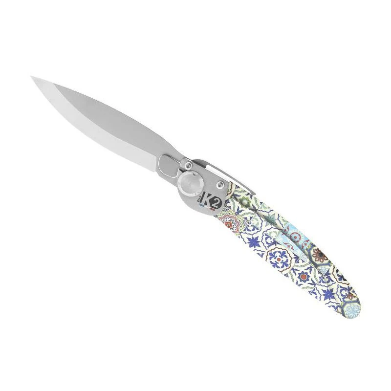 Si vous êtes un amateur ou une amatrice d’objets en faïence, alors nul doute que ce couteau pliant K2 (référence K2.14M) vous plaira. Conçu et fabriqué en France par Roger Orfèvre, il possède un manche en acier inoxydable décoré avec goût par un bel imprimé 3D faïence plein de charme, d’élégance. Une jolie poignée que l’on ne se lasse pas d’admirer tant elle est élégante, elle mesure 115mm de long afin que le transport ne soit jamais un problème au quotidien. La lame est conçue en acier Z40C13 microbillé et bénéficie d’un système de verrouillage K-Lock, sa forme est également très harmonieuse, originale. Possibilité de personnaliser la lame par un texte au choix, et cela au niveau des deux faces (recto/verso) via le bouton ajouter une gravure ci-dessous. Le logo K2 est présent entre le manche et la lame, couteau K2.14M livré avec un étui suédine pour le transport, la protection, ainsi qu’une pochette cadeau si vous désirez l’offrir. Avec clip.