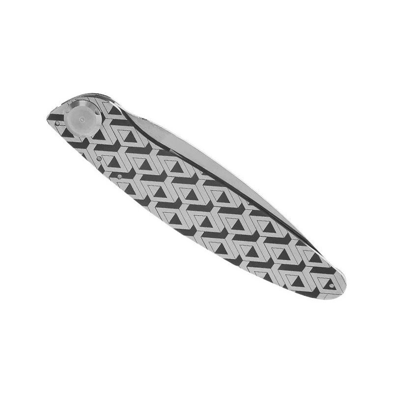 Ce modèle K2.07 est doté d’un manche en acier inoxydable joliment décoré par des motifs perspectives, avec de belles formes géométriques cubiques mises en évidence par de simples lignes. Et ce qui est très esthétique, c’est que le modernisme des perspectives est associé à l’authentique de l’habillage bois olivier. Un subtil mariage des matériaux pour un résultat très chic ! Pour information, le manche mesure 115mm de longueur offrant ainsi une facilité de transport quotidienne. Le couteau de poche K2.07, modèle perspectives, possède une lame tranchante fabriquée en acier Z40C13 et équipée du système de verrouillage K-Lock. Avec mitre marquée elle aussi par l’inscription K2.