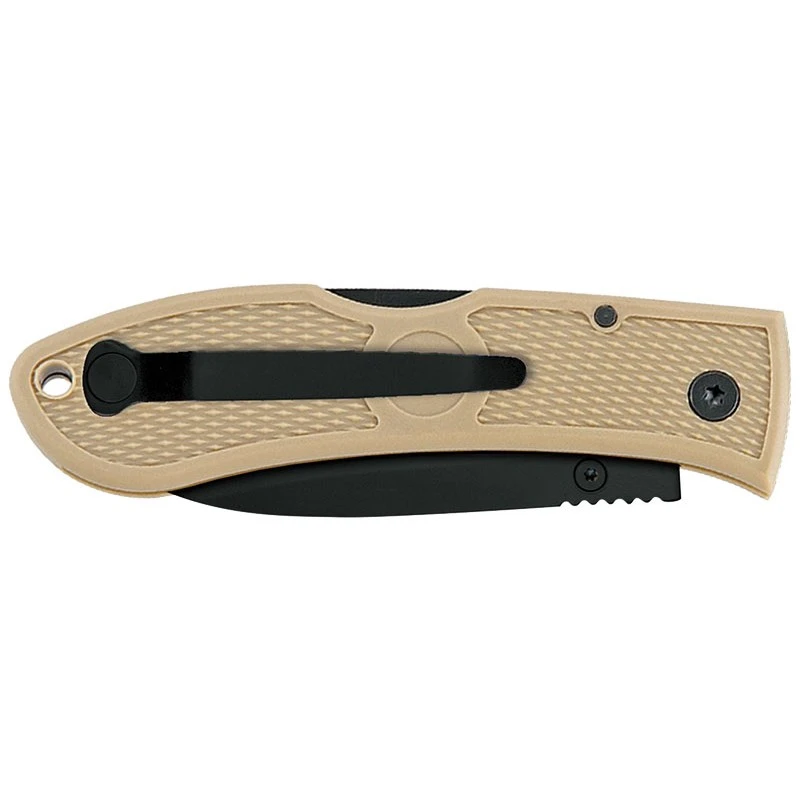Le Dozier Folding Hunter de la marque Ka-Bar, modèle KA4062CB, correspond Ă la version coyote du populaire couteau de la marque AmĂ©ricaine. Comme son nom peut le laisser penser, il possède un manche de couleur « coyote » en zytel, une couleur marron clair que vous apprĂ©cierez sans doute beaucoup. La poignĂ©e est texturĂ©e ce qui engendre une meilleure prĂ©hension en main, elle est marquĂ©e par l’inscription Ka-Bar dans un cercle au niveau du milieu. Grâce au trou pour lanière ainsi que le clip de poche noir pour le contraste au dos, la transportabilitĂ© est excellente, il est simple de le transporter d’un bout Ă l’autre.