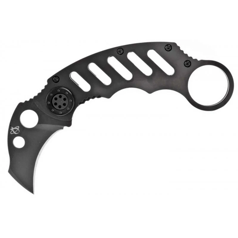 Fabriqué en acier 420J2 noir, le manche du Mantis Knives MK1 est lui aussi ajouré à cinq reprises par des formes inclinées ressemblant à des rectangles aux bords arrondis. Tenant confortablement en main, il est enrichi d’un large anneau en bout, karambit oblige !