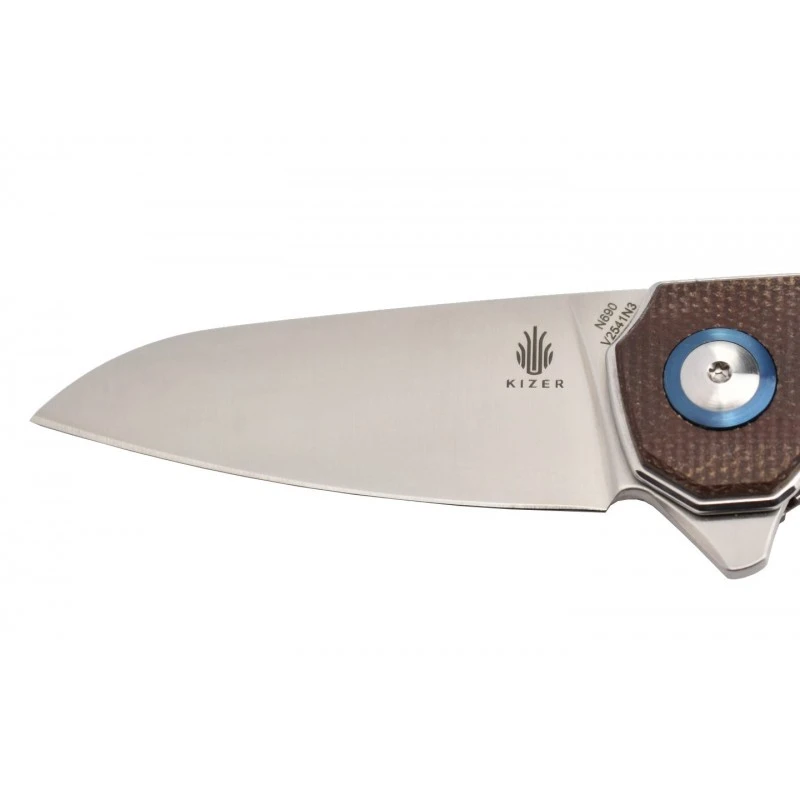 Le Kizer Lieb de Azo, version micarta marron, est un couteau qui ne manque pas de tranchant avec une lame drop point de 6cm environ, en acier inoxydable N690. Une lame à la finition stonewashed, qui se verrouille par l’intermédiaire du mécanisme liner lock, l’ouverture est grandement facilitée grâce au flipper. Les rondelles empêchent la saleté et les débris de gripper le mécanisme, pour une excellente durabilité. Possibilité de graver la lame qui est d’ailleurs déjà décorée au recto par le logo Kizer. Également disponible en version G10.