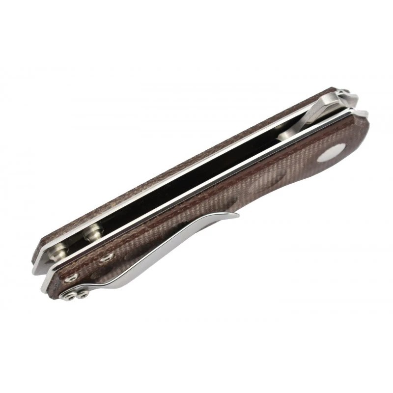 Le Lieb est une création du célèbre designer Azo, pour Kizer, marque Chinoise en plein développement. Porteur de la référence V2541N3, ce couteau est relativement compact, et donc facilement transportable, si bien qu’il deviendra rapidement votre compagnon du quotidien. Non seulement agréable à regarder, il est aussi agréable à tenir en main, son manche est fait de micarta marron, il est décoré par de beaux motifs arrondis, pour un style inimitable. Longueur du couteau pliant en position fermée : environ 88mm. Prise en main solide à trois doigts, un détail qui a son importance et qu’il fallait souligner.