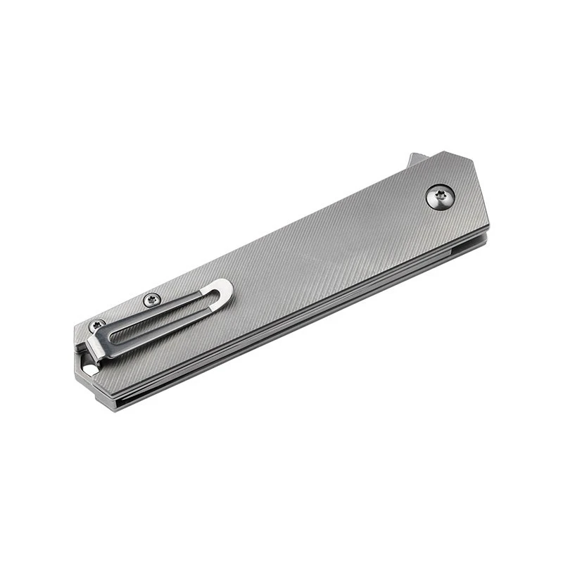 Présentant une texture en diagonale au design très particulier, le manche en titane souligne le caractère affirmé du couteau. Très soigné et robuste, il accueille un petit clip au dos visant à simplifier les transports quotidiens. Avec trou de lanière. Livré avec son étui en nylon de haute qualité.