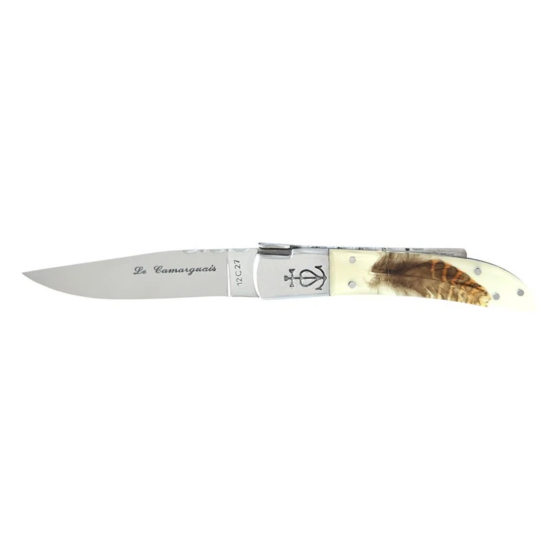 Ce couteau le Camarguais n°12 trident forgé va beaucoup plaire à celles et ceux qui apprécient la beauté de la Camargue ainsi que la nature de façon générale. Sa principale caractéristique, c’est ce manche en plume de bécasse noyée dans de la résine : une poignée à la puissance esthétique forte.