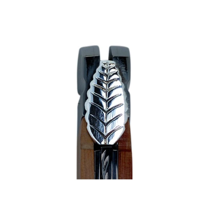 La Corrèze est un dĂ©partement de la rĂ©gion Française Nouvelle-Aquitaine, avec des villes comme Tulle ou encore Brive-la-Gaillarde. Faites-plaisir aux CorrĂ©ziens amateurs de coutellerie en leur offrant ce couteau pliant Le Correze, modèle 1452. Il possède un manche mesurant 12cm de long, conçu en bois genĂ©vrier, avec ressort guillochĂ© et sa feuille de châtaignier. Le couteau de poche dispose aussi d’une lame en acier inoxydable Z100 sur laquelle on peut voir l’inscription gravĂ©e « Le correze » au recto ou face avant si vous prĂ©fĂ©rez. Gardez bien en tĂŞte que vous pouvez personnaliser le dos de la lame par le texte de votre choix, qui vous fait plaisir, ou qui fera plaisir Ă celui ou celle qui recevra le couteau en cadeau. Une mitre est prĂ©sente en acier inoxydable mat, elle fait la jonction entre la lame et le manche genĂ©vrier.