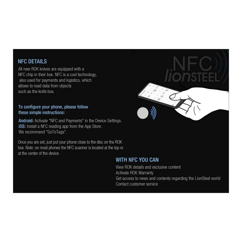 La marque LionSteel et son célèbre designer Molletta ont conçu un couteau de poche à la pointe de la technologie puisqu’il est livré dans une belle boîte avec puce NFC. Utilisez votre smartphone comme lecteur NFC pour avoir accès à de nombreuses informations à propos du couteau LionSteel ROK Aluminium noir. Soulignons aussi le fait que le manche est monobloc, soit taillé en centre d’usinage à partir d’une seule pièce de matière.