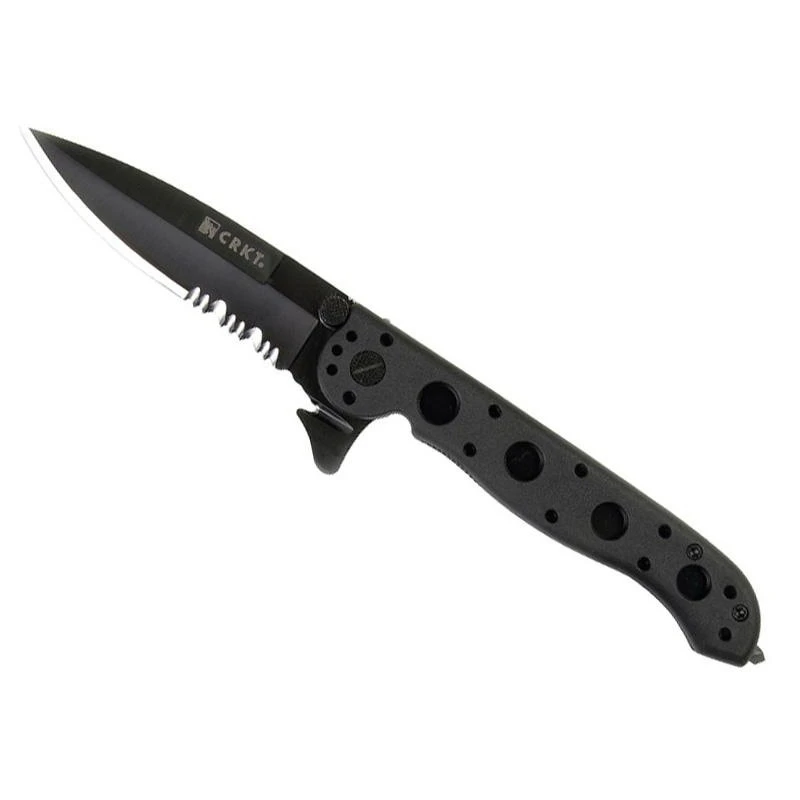 C’est Kit Carson qui est Ă l’initiative du CRKT M16-13ZLEK, modèle Law Enforcement signifiant forces de l’ordre. On comprend donc immĂ©diatement que nous sommes en prĂ©sence d’un couteau pliant tactique pour professionnels exigeants. Le M16-13ZLEK possède une lame semi-dentĂ©e, fabriquĂ©e en acier AUS-8 riche en carbone, comprenant un revĂŞtement en nitrure de titane noir. Ă€ bouton double, la lame intègre un Carson Flipper pour faciliter son dĂ©ploiement, ce dernier fait aussi office de coupe-ceinture. Durant les utilisations, la sĂ©curitĂ© est de mise, grâce au liner lock, mais surtout le système Automated Liner Safety (levier de sĂ©curitĂ© supplĂ©mentaire pour la fermeture de la lame). Le couteau CRKT M16-13ZLEK Law Enforcement noir est dotĂ© d’un manche en nylon et fibre de verre, particulièrement rĂ©sistant, avec fonction brise-vitre en bout en cas d’urgence. Comme tous les couteaux issus de la sĂ©rie M16, le manche est ici Ă trous, avec un beau coloris noir ainsi qu’un clip de poche au verso. Un couteau pliant conçu par des professionnels, pour des professionnels !