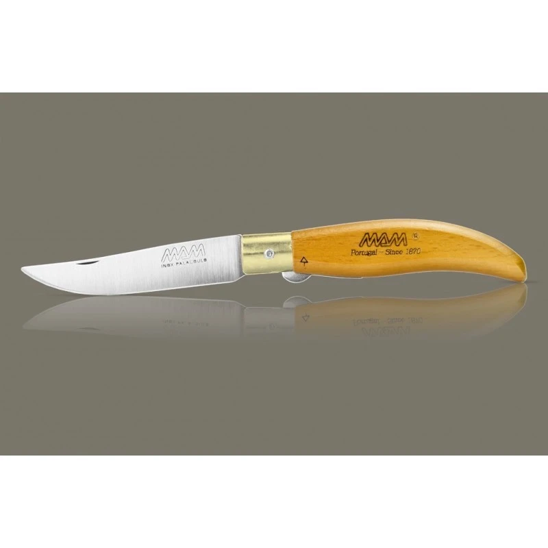 Ce couteau MAM 2010 est doté d’un manche en bois hêtre dont la partie supérieure est légèrement arrondie, de quoi créer une courbe très élégante. Le manche mesure exactement 91mm de long et dispose en guise de décoration le texte « MAM Portugal since 1870 » faisant référence au début du fabricant Portugais : MAM. Au niveau de la lame, elle mesure 75mm de long et est conçue en acier inoxydable dans l’optique de trancher aisément et de parfaitement résister à la corrosion. En plus d’être tranchante, la lame est aussi très élégante puisqu’elle est marquée du logo MAM. Sachez que vous pouvez personnaliser le dos de la lame du couteau MAM 2010, de quoi créer un modèle unique au monde ! Un formidable couteau de poche pliant signé MAM que vous allez adorer, tant pour son design que pour son prix !