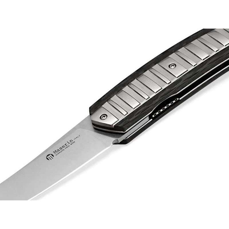 Le Maserin AM5 375.TT est un couteau de poche type gentleman Ă l’allure hyper Ă©lĂ©gante. Il possède un manche de 12cm de long conçu en fibre de carbone, avec inserts titanium gris crĂ©ant ainsi un joli contraste noir/gris. D’ailleurs, au dos du manche, se trouve un clip de poche titanium servant Ă transporter le couteau Maserin AM5 avec toujours plus de facilitĂ©. De toute façon, sa faible longueur permet de le ranger facilement n’importe oĂą (poche, sacoche, sac Ă dos …).