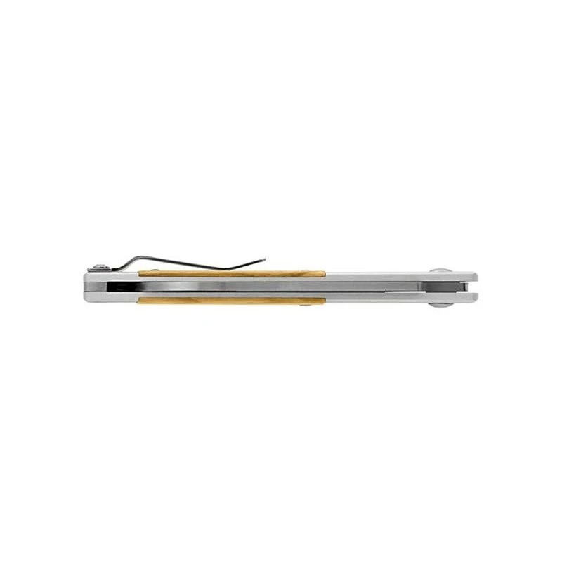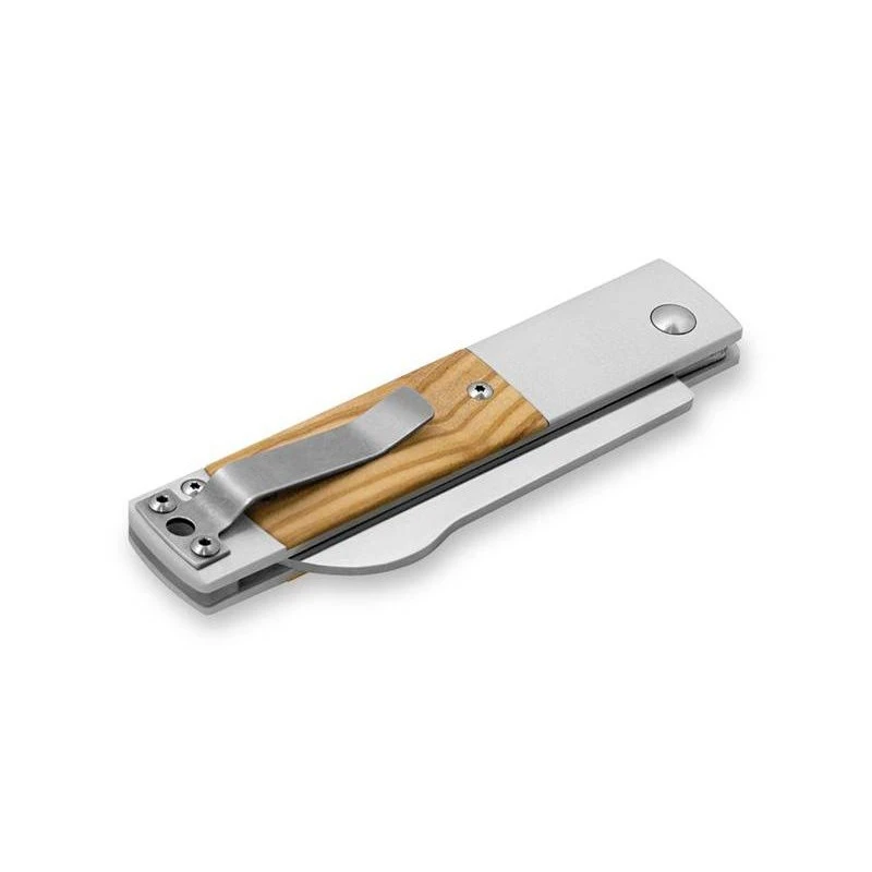 Mélange de modernisme et de tradition, le Maserin In-Estro olivier (165.OL) est un couteau EDC conçu par le designer Bonus (Alessandro Olivetto). Mesurant exactement 105mm de long, son manche est fabriqué en aluminium anodisé gris, avec plaquettes en bois olivier, apportant la petite touche rustique/authentique qui fait toute la différence. Esthétique, la poignée est aussi très agréable à manipuler, elle comprend un clip de poche au dos ainsi qu’un trou pour lanière en bout, ou passe-lacet si vous préférez. Vous l’aurez compris, le couteau Maserin In-Estro se transporte avec beaucoup de facilité !