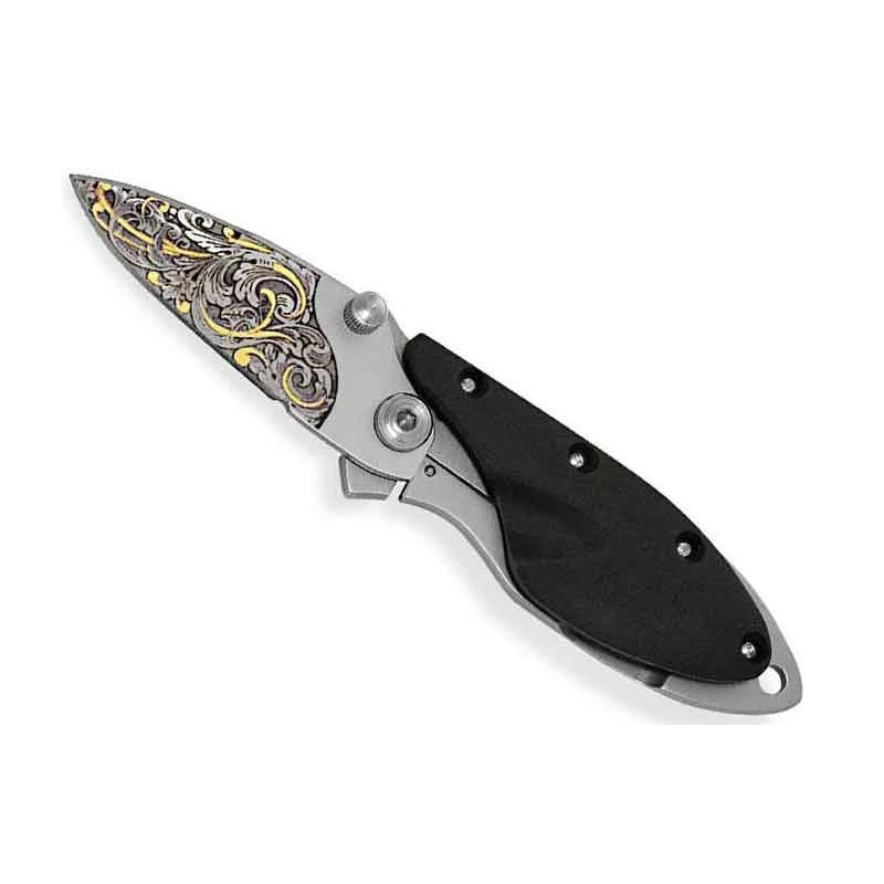 Le Maserin Onefold 550.KT est un couteau type gentleman, qui représente à lui seul l’élégance, le style. Une création du designer Moris Baroni, que l’on repère aisément pour sa courte lame en acier 440C satiné, à cran intérieur, sublimée par une gravure en or 24 carats, déposée à l’aide d’un procédé électrochimique. Tout cela permet de créer un motif juste magnifique, qui attire l’œil par ses nuances dorées. Une lame certes très esthétique, mais qui ne manque pas de tranchant, bien au contraire !