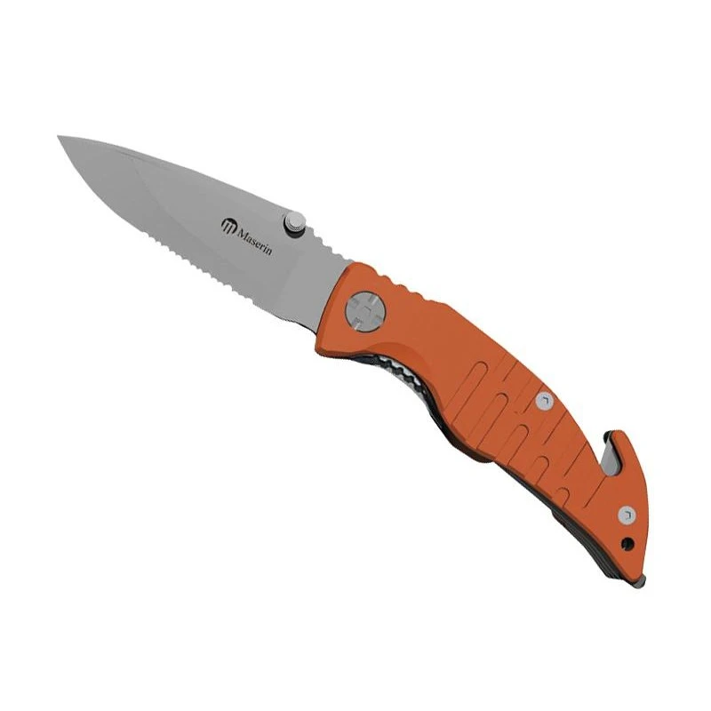 Le couteau pliant Maserin Rescue 2 est doté d’une lame à dents conçue en acier satiné N690Co à cran intérieur et à bouton : elle mesure 90mm de longueur. Parfait pour les activités de sauvetage et de secourisme, le couteau possède aussi un manche de longueur 12cm en aluminium anodisé orange, il fait également office de pic brise-vitre et coupe-ceinture de sécurité. Grâce au clip, le couteau Maserin Rescue 2 référence 283 est facile à transporter : il vous suivra durant toutes vos interventions sans jamais vous gêner. Pratique, ce modèle conçu en Italie est livré avec son étui en nylon permettant d’en prendre soin au quotidien. Un couteau de poche signé Maserin pour tous les sauveteurs !
