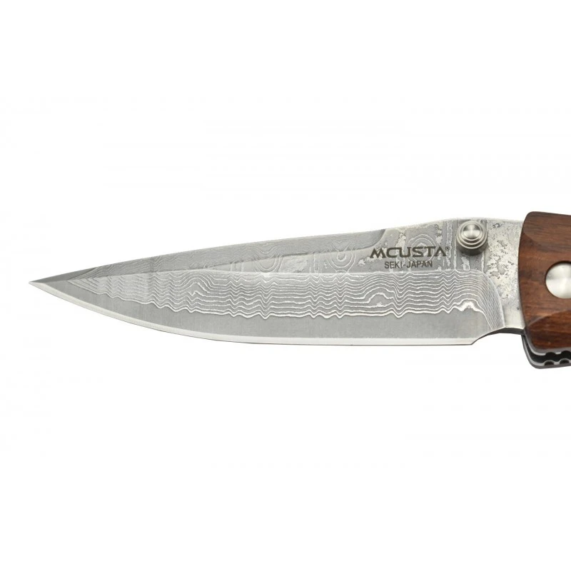 Ce couteau Mcusta MC-125D est muni d’une lame en acier inox Damas, avec le logo Mcusta en guise de décoration (Seki Japan). Il faut mentionner la présence d’un double thumb stud facilitant grandement l’ouverture de la lame, le système de verrouillage est de type liner lock. Pour information, la lame damas mesure 93mm de longueur et comporte un bout pointu, elle est extrêmement tranchante. Couteau pliant Mcusta fabriqué à Seki au Japon.