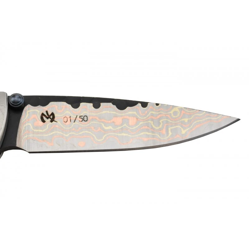 Ce modèle MC33MD est la résultante d’une collaboration avec la marque Max Knives. C’est un couteau de collection d’exception qui est disponible en série limitée (50 pièces). D’ailleurs, chaque couteau est numéroté sur la lame en acier Damas Mokumé, martelée sur la partie supérieure. Mesurant 7cm de longueur, la lame peut être déployée en toute simplicité via le pouce grâce au double thumb stud, le verrouillage est ici de type liner lock. Ce modèle Take MC33MD, signé Mcusta et Max Knives, se dote d’un manche en acier damas façon bambou. En coutellerie, il est rare que les manches soient conçus en damas ce qui confère au MC33MD un charme unique. Longueur du manche : 93mm. Couteau collector livré dans un étui Nishijin.