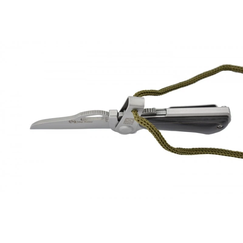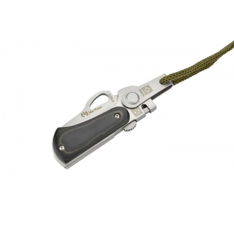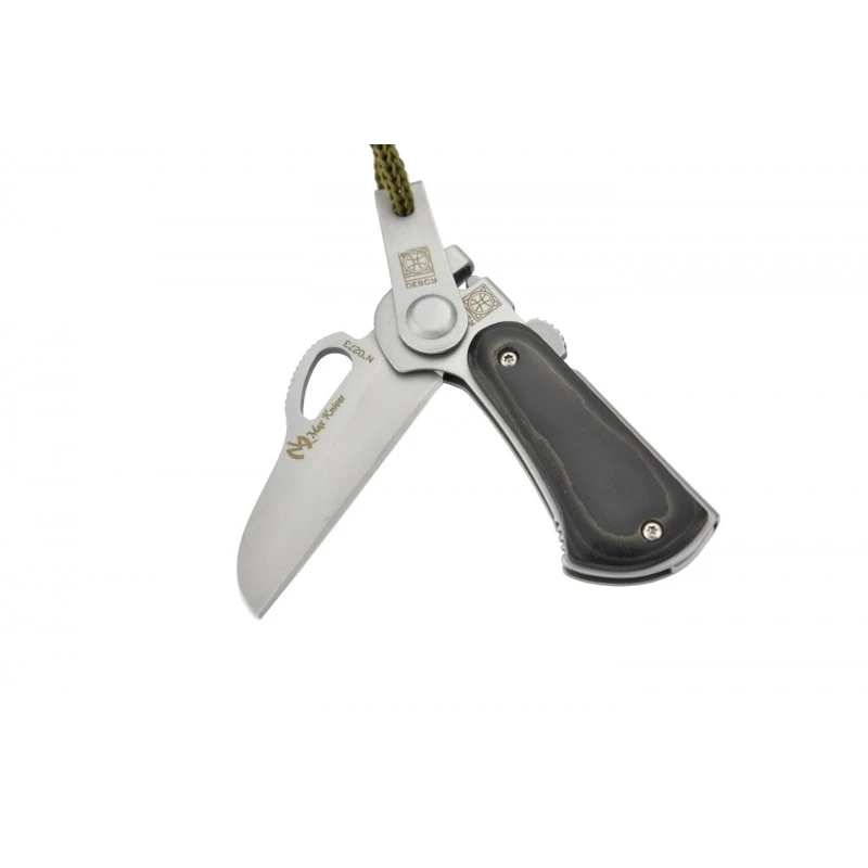 Le Max Knives Croc H est une création du coutelier Alain Descy, un couteau pliant qui intègre un manche noir en micarta mesurant 78mm de long en position fermée. Un clip ceinture est présent au dos de la poignée, on soulignera aussi la présence d’un cordon vert assurant de ne jamais égarer le couteau. On peut apercevoir sur la partie mobile située entre la lame et le manche, le logo Alain Descy, à l’origine de ce mini couteau pliant.