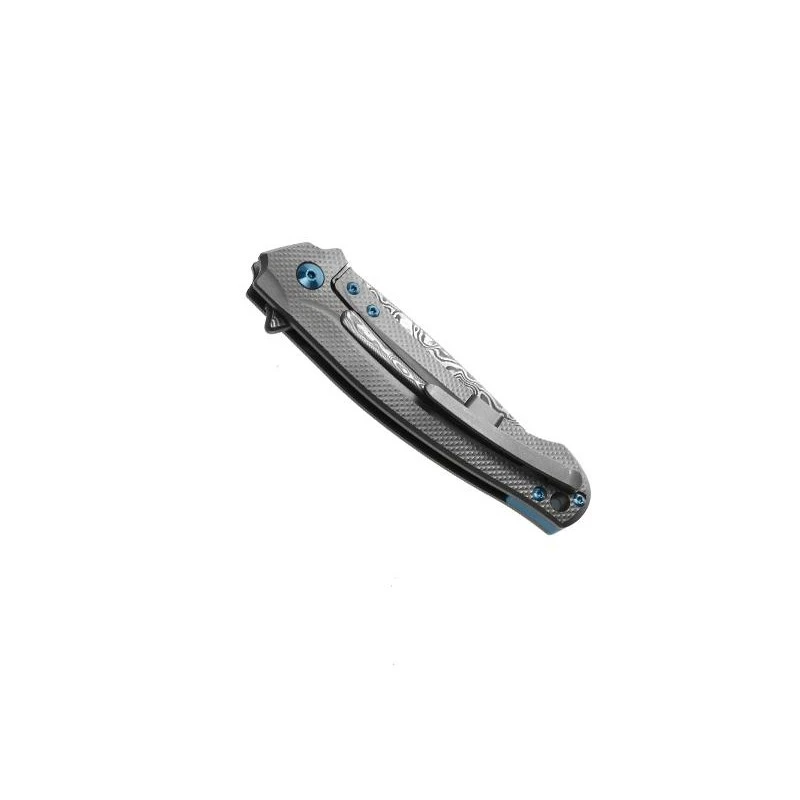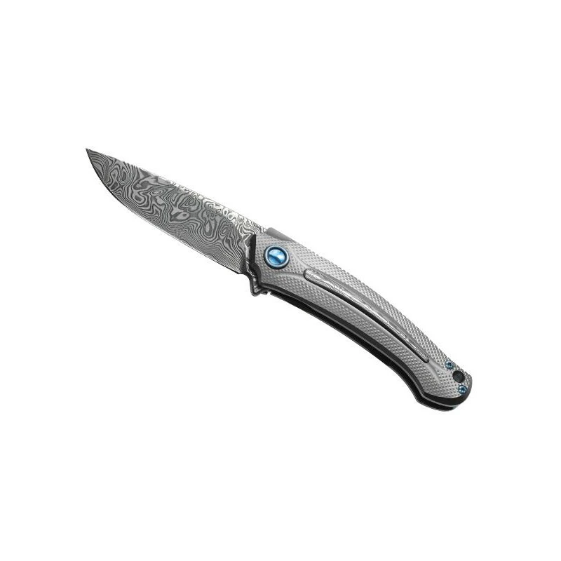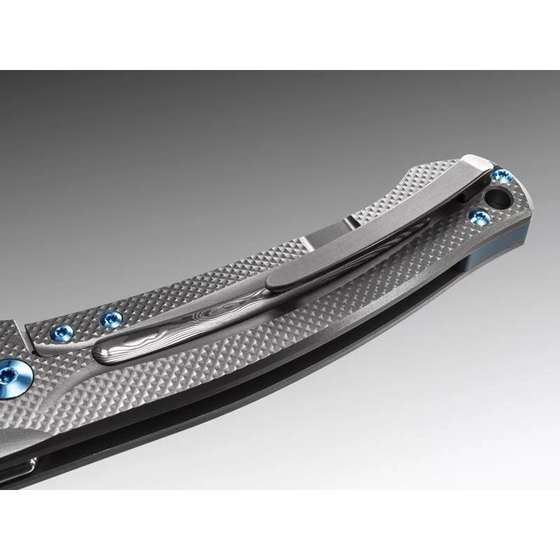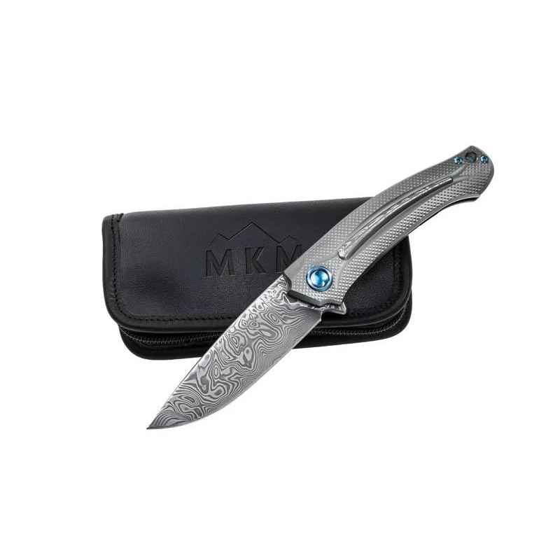 Bien plus qu’un simple couteau de poche, une vĂ©ritable Ĺ“uvre d’art, voilĂ comment on pourrait rĂ©sumer en quelques mots le couteau MKM Arvenis FX01D par Fox Knives. Il faut dire qu’il intègre un superbe manche de longueur 12cm en titanium 6AL4V avec inserts en acier damas Vinland. Un manche extrĂŞmement design mais aussi ergonomique avec une prise en main excellente en toutes circonstances. Le manche possède aussi un clip en titanium gris pour le transport, un pivot et des vis en titanium bleu.