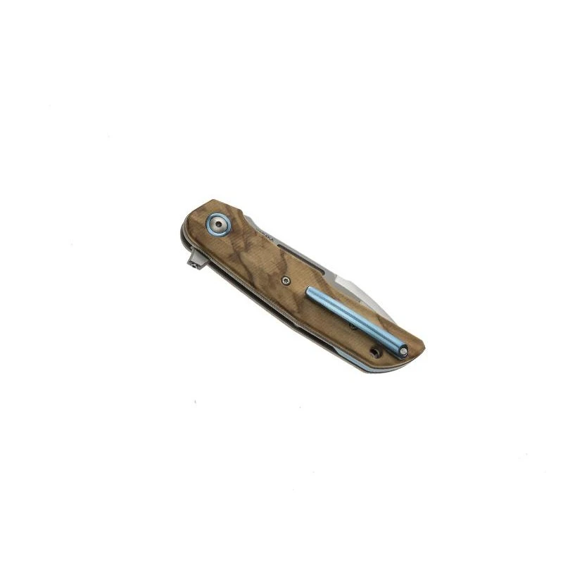 Sur ce couteau MKM Clap LionSteel LS01O, ne cherchez pas de mitre car il n’y en a tout simplement pas. Il se compose d’un manche Ă©lĂ©gant fabriquĂ© en bois olivier avec entretoise et clip en titanium bleu. De plus, le manche ne mesure que 11cm de longueur ce qui garantit Ă l’utilisateur une facilitĂ© de transport au quotidien. En plus, il tient très bien en main : l’ergonomie est juste excellente. N’oubliez pas que le couteau MKM Clap LS01O par LionSteel est livrĂ© avec sa pochette noire en nylon dĂ©corĂ©e aux couleurs de l’Italie, son pays de fabrication, Ă Maniago pour ĂŞtre très prĂ©cis.