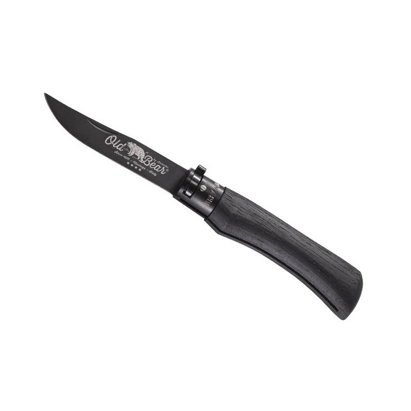 Ce couteau Old Bear Total Black 311.XL porte bien son nom car il est en effet entièrement noir, et ce, même jusqu’à la virole de sécurité en aluminium anodisé (position ouverte/fermée). Sinon, on retrouve une lame en acier 420 avec revêtement PTFE noir, ainsi qu’un manche de longueur 13cm en bois d’ayous stratifié. À noter qu’il s’agit du modèle le plus grand (taille XL), toutefois, ce couteau Old Bear Total Black 311.XL reste très transportable puisqu’il peut être rangé dans une poche ou un sac sans la moindre difficulté. La lame se montre elle très tranchante et robuste, il est possible de la personnaliser au dos par gravure. De qualité, ce couteau de poche Old Bear Total Black virole noire XL est fabriqué de façon artisanale en Italie. Il vous sera livré en boîte individuelle, avec certificat de contrôle qualité. Pour ceux qui préfèrent les couteaux plus compacts, sachez que ce modèle existe en version plus petite (XS, S, M, L).