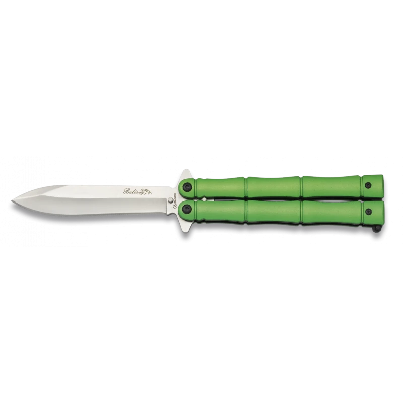 Ce couteau papillon sans anneau Albainox modèle Balisong 36227 est muni d’un manche squelette vert en aluminium. Le manche est qualifié de cette façon du fait que des lignes verticales sont présentes : on a alors l’impression qu’il est composé d’os. On pourrait également dire que c’est un manche vert en bambou, il est très ergonomique et offre du confort à l’utilisateur au niveau de la prise et tenue de main.