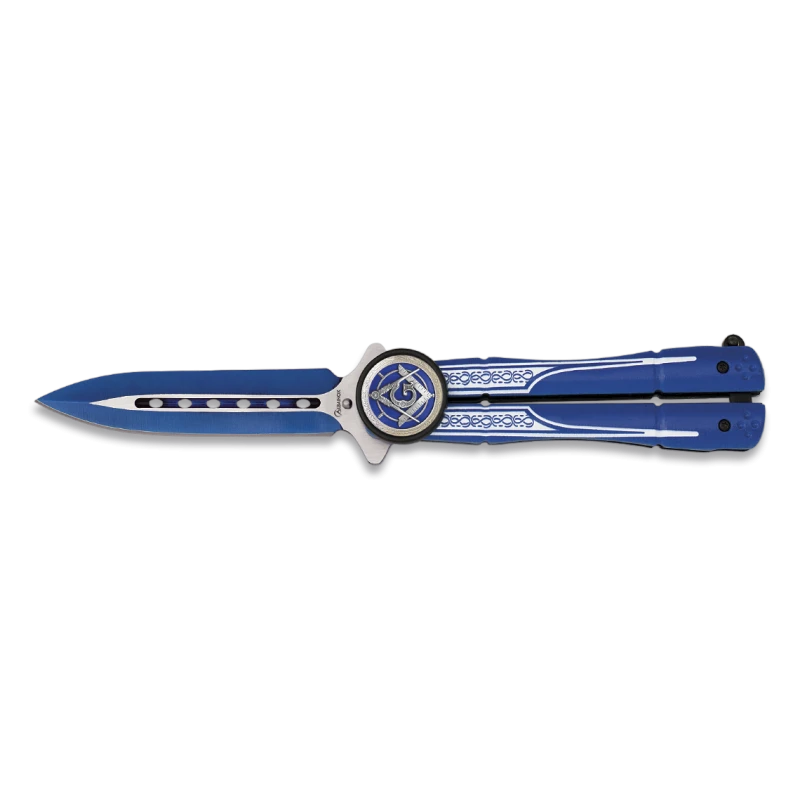 Ce couteau papillon Albainox bleu électrique est à offrir à tous les adeptes de la franc-maçonnerie, autrement dit à tous les francs-maçons. Pour résumer simplement la chose, sachez que ceux sont des sociétés secrètes fondées autour de la « fraternité« . Ce couteau papillon est justement muni d’un manche bleu électrique en aluminium décoré de motifs blancs : il y a même un cercle avec à l’intérieur le logo de la franc-maçonnerie : autrement dit l’équerre et le compas entrelacés.