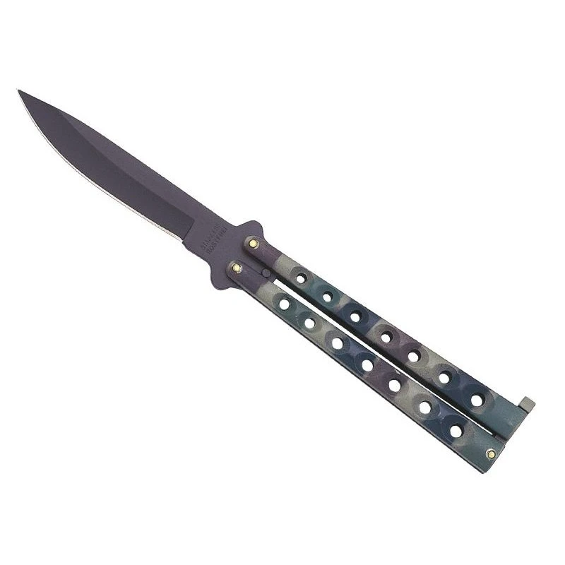 Grâce à son manche camouflage de longueur 12.5cm, ce couteau papillon Keen Blades 57125 est muni d’une allure très militaire. Balisong oblige, ce modèle est muni d’un manche en deux parties : chaque partie intègre exactement 7 trous bien alignés de quoi conférer un look stylé au couteau papillon. Grâce à son petit gabarit (12,5cm), vous pourrez emporter ce couteau d’entraînement très facilement au quotidien.
