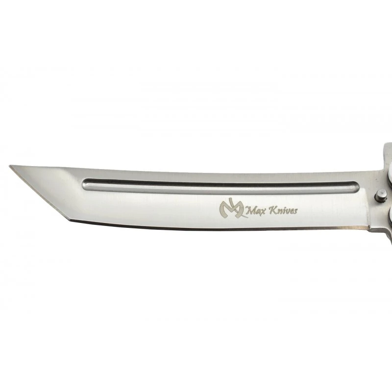 Le couteau papillon Max Knives P46S possède une lame de 105mm de longueur en acier inoxydable 3Cr13 : elle assure tranchant et résistance à la corrosion. Sa forme tanto assure un style percutant ainsi qu’une meilleure puissance, elle est agrémentée d’une rainure généreuse avec en-dessous, le logo Max Knives. Également disponible en version noire, cette lame peut être gravée en supplément (voir bouton ajouter une gravure).