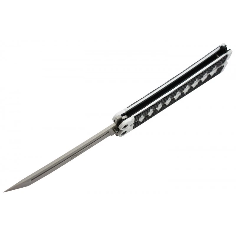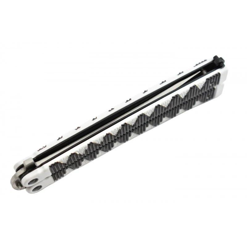 Celles et ceux qui aiment les couteaux papillons d’inspiration japonaise auront beaucoup de mal à résister à l’appel du Max Knives P46S. Un balisong qui séduit par sa forme courbée au niveau du manche de 127mm de long en aluminium blanc ainsi que noir. Le tressage japonais ne vous laissera probablement pas indifférent(e). Agréable à prendre en main, la poignée est très visuelle et riche en contraste : on peut d’ailleurs observer de nombreux triangles blancs par dessus le fond noir.